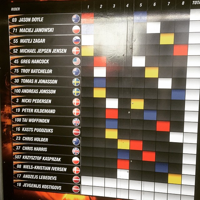 A világbajnokság jelenlegi ranglista vezetője Nagy-Britannia csodagyereke Tai Woffinden,aki 12 pontos előnnyel várja a holnapi folytatást.